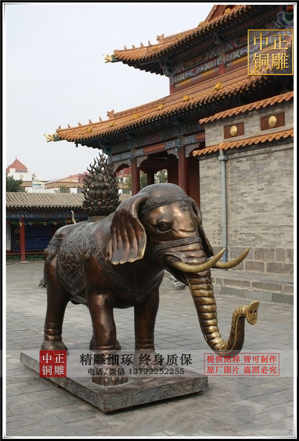 銅大象在印度、泰國稱為“象神”,大象的鼻子可吸水象征可把外面的財(cái)吸進(jìn)來,銅大象擺放在公司門口或家里都有招財(cái)作用,其中背馱金蟾的大象謂之“向上發(fā)財(cái)”。因?yàn)槿f象更新的“象”,諧音“祥”、和“相”,古人云:“太平有象”,寓意“吉祥如意”。