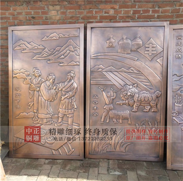 銅浮雕以不銹蝕、不脫色的優質紫銅為原料,經過多道工序精制而成,在內容和形式上與地方特色文化緊密結合,具有做工精細、形象逼真、立體感強、風格古樸、畫面栩栩如生、可永久收藏等特點。銅浮雕選材貼近現實生活,是民間的藝術精靈,他展現著人們的思想和審美。這種浮雕制作技術流傳在民間,訴說著民間的故事。